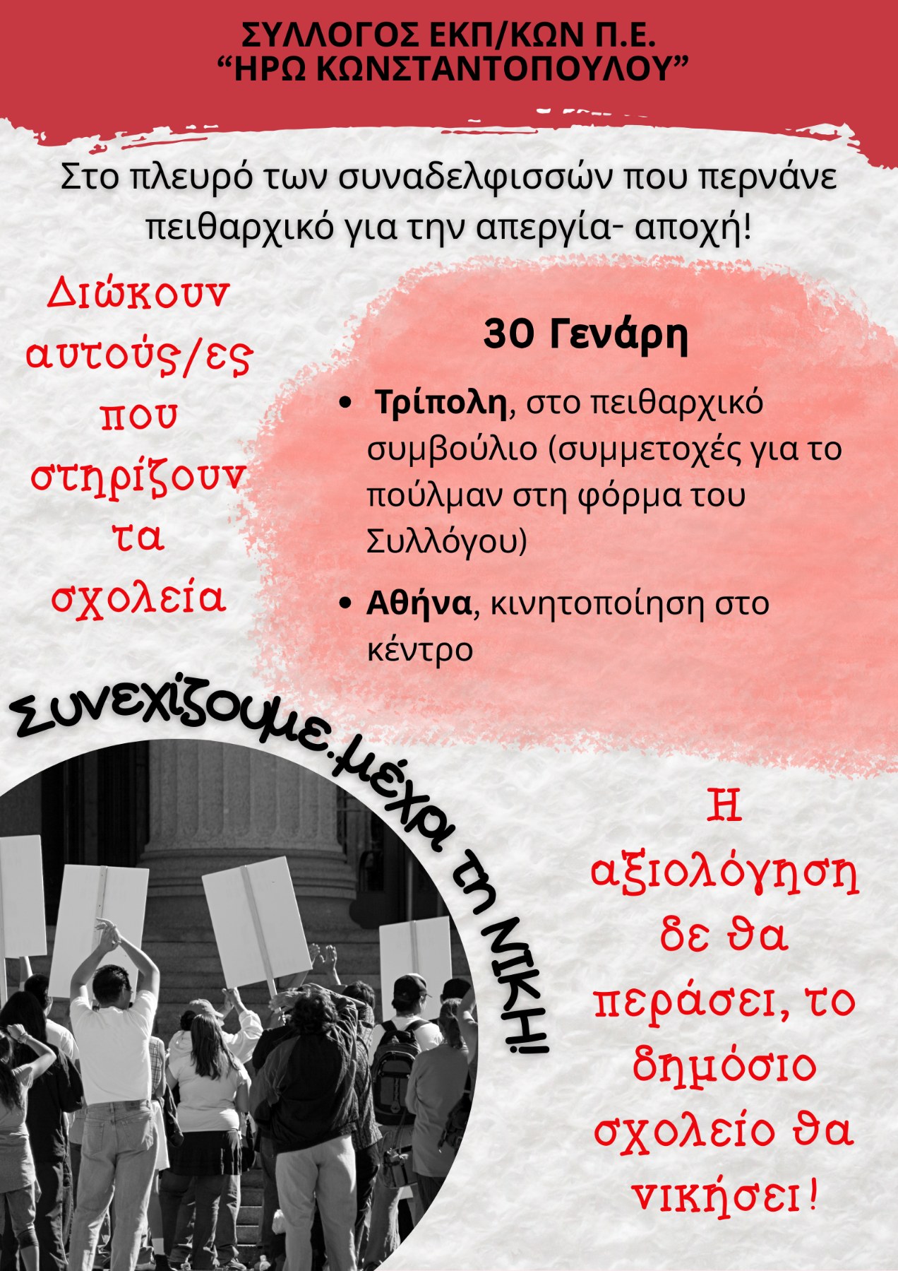 Η πρώτη αυτή εκδίκαση πειθαρχικών, όπως κατανοούμε αποκτά ιστορικής σημασίας αξία. Στην ουσία εκδικάζεται το συνταγματικά κατοχυρωμένο δικαίωμα στην απεργία. Οι δυο συνεχείς αναβολές δείχνουν πως η μαζική παρουσία μας τους χαλά τα σχέδια! Η 30η Γενάρη να γίνει και πάλι μέρα καταδίκης του Υπουργείου και της κυβέρνησης, της επίθεσης στο απεργιακό δικαίωμα, στους συλλογικούς αγώνες και στα σωματεία! Μέρα καταδίκης των δ/ντων εκπαίδευσης που παρανόμησαν και παρέπεμψαν σε πειθαρχικά απεργούς εκπαιδευτικούς! Την Παρασκευή 30/1 θα βρεθούμε στον δρόμο ξανά λοιπόν πολύ περισσότερες και περισσότεροι! Με συγκεντρώσεις παντού από τη μία άκρη της χώρας στην άλλη, με πούλμαν στην Τρίπολη και συγκέντρωση στην Αθήνα.