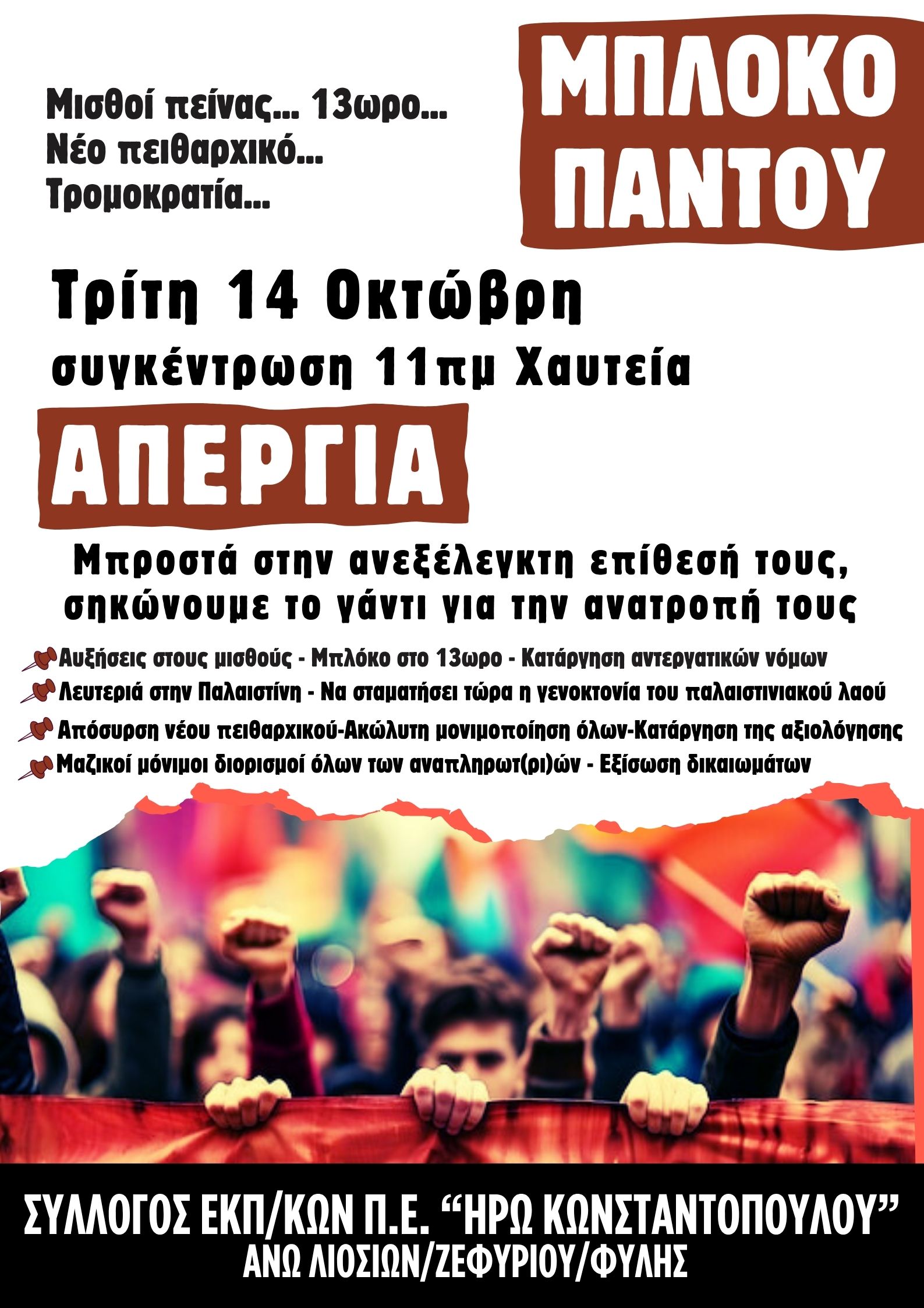 Συνέχεια ανάγνωσης Όλες και όλοι στην απεργία 14 Οκτώβρη – Συγκέντρωση του συλλόγου στις 11 πμ στα Χαυτεία (Αιόλου και Σταδίου)